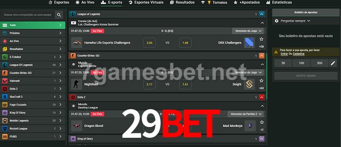O 29bet oferece uma grande seleção de opções de apostas em e-sports com probabilidades competitivas